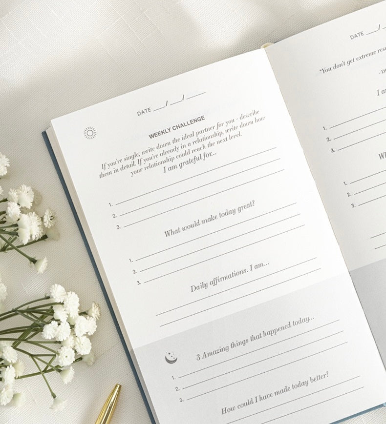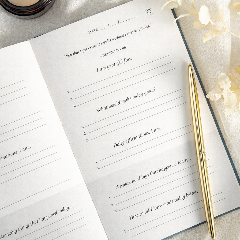 Un journal guidé et tructuré, conçu pour clarifier vos pensées, renforcer votre discipline mentale et instaurer un rituel quotidien de gratitude en moins de cinq minutes par jour.