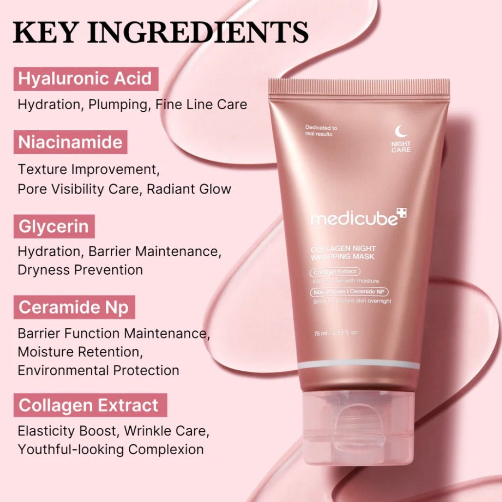 Le Collagen Night Wrapping Mask de Medicube est un masque de nuit enveloppant innovant, conçu pour agencer un film protecteur riche en actifs hydratants et raffermissants qui agit pendant le sommeil. Sa formule se solidifie en une pellicule facile à retirer sans résidus, permettant aux ingrédients de travailler intensivement pendant la nuit pour une peau plus hydrater, rebondie et lumineuse au réveil.